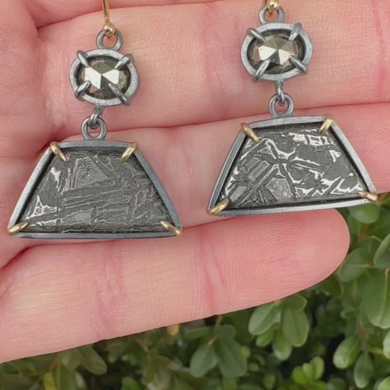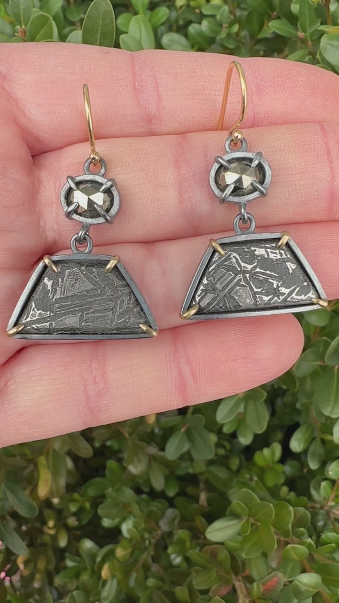 Aletai Meteorite set with solid 18k gold prongs is paired with rose cut pyrite in these statement earrings. The earrings are handmade out of sterling silver, which has been given a brushed, oxidized patina.