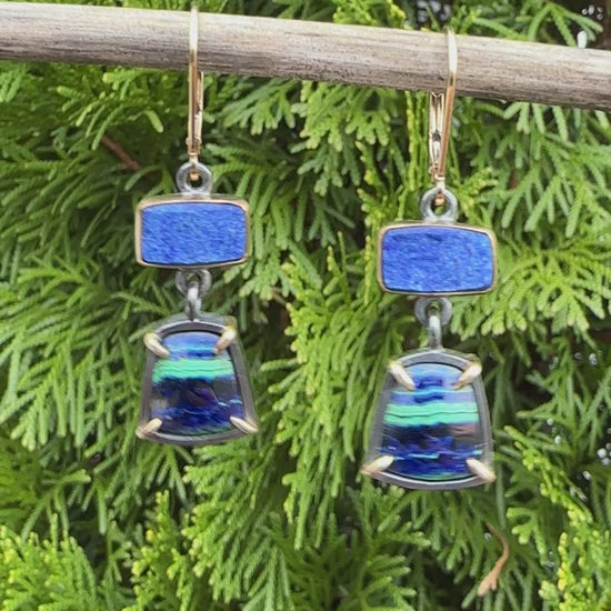 Azurite Malachite, Natural Surface Lapis Lazuli, 22k and 18k gold and Sterling Silver Dangle Earrings