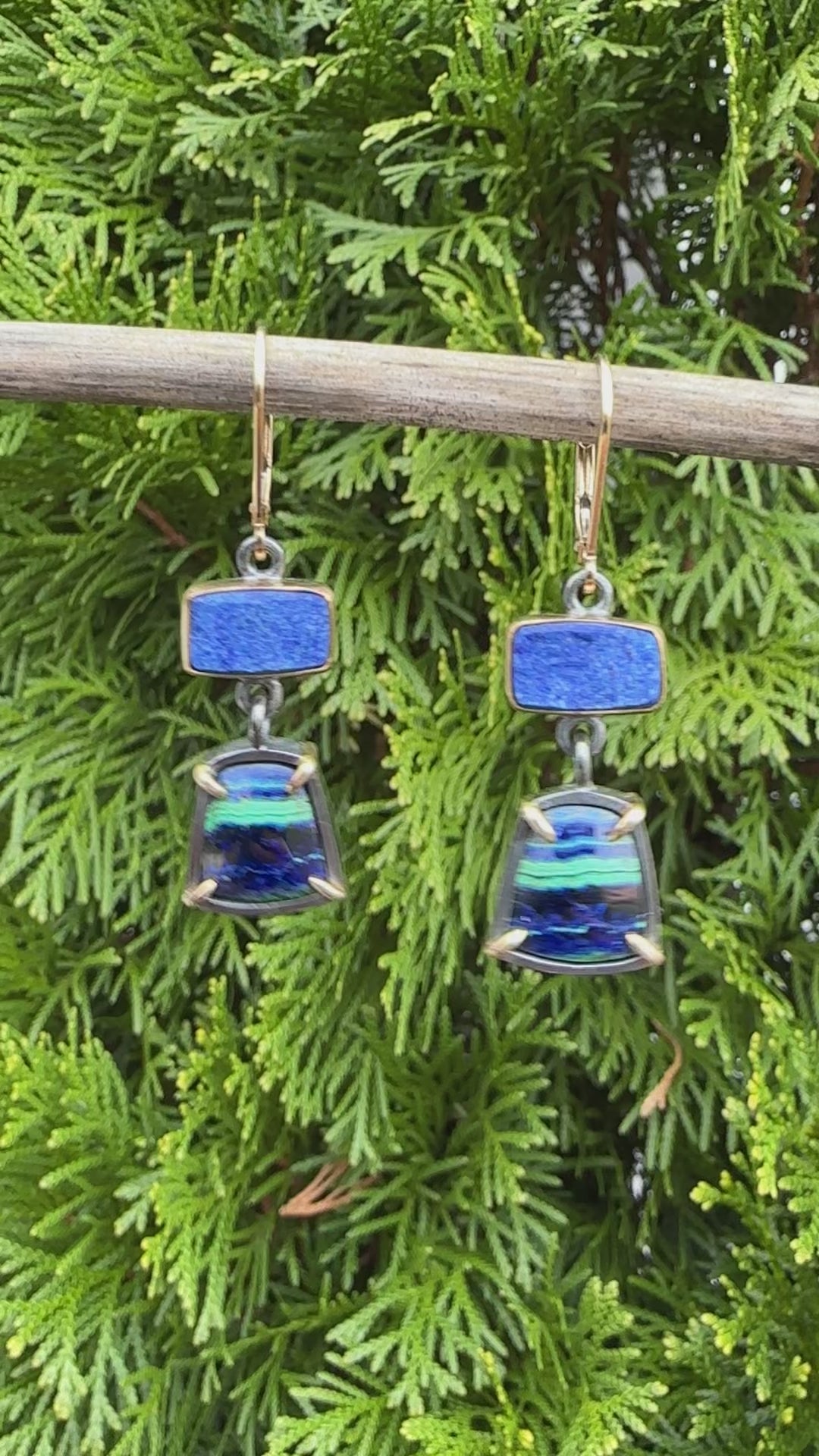 Natural surface lapis lazuli set in solid 22k yellow gold bezels are paired with are paired with high grade azurite malachite with vibrant colors and a stunning pattern. The azurite malachite are set with solid 18k gold prongs. The remainder of the settings are oxidized sterling silver. The lever back style ear wires are gold filled.
