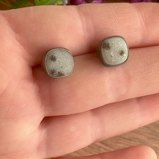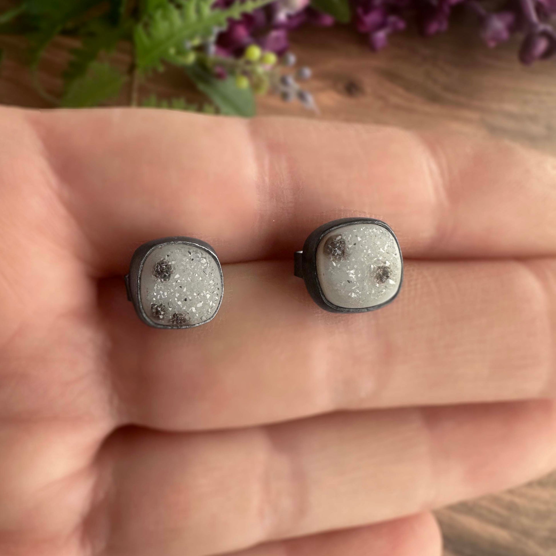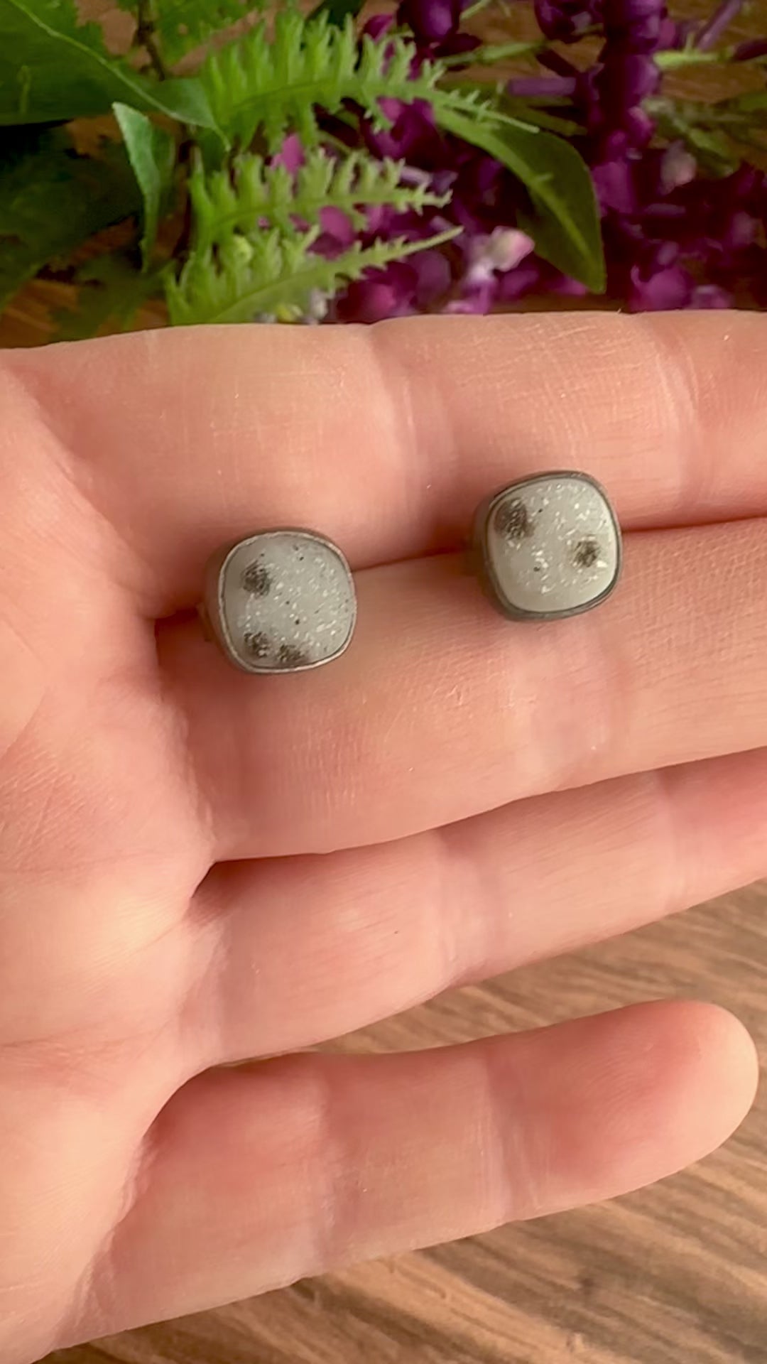 Two stunning spotted drusy cabochons are the focus of these smaller size stud earrings. The earring are handmade out of fine sterling silver which has been given an oxidized brushed finish.