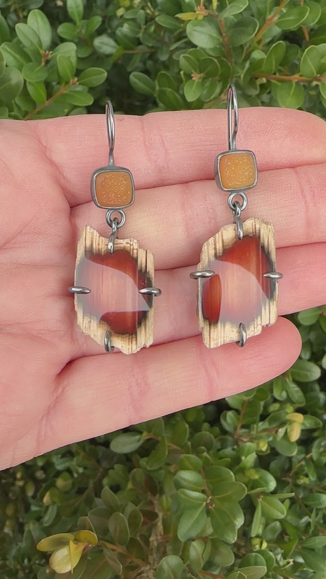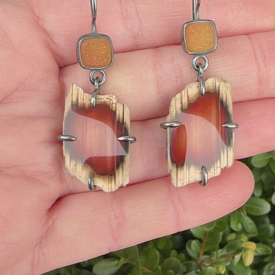 The focus of these earrings are gorgeous, natural edge Sumatran agate, paired with golden drusy. The earrings are handmade out of sterling silver, which has been given a brushed, oxidized patina.