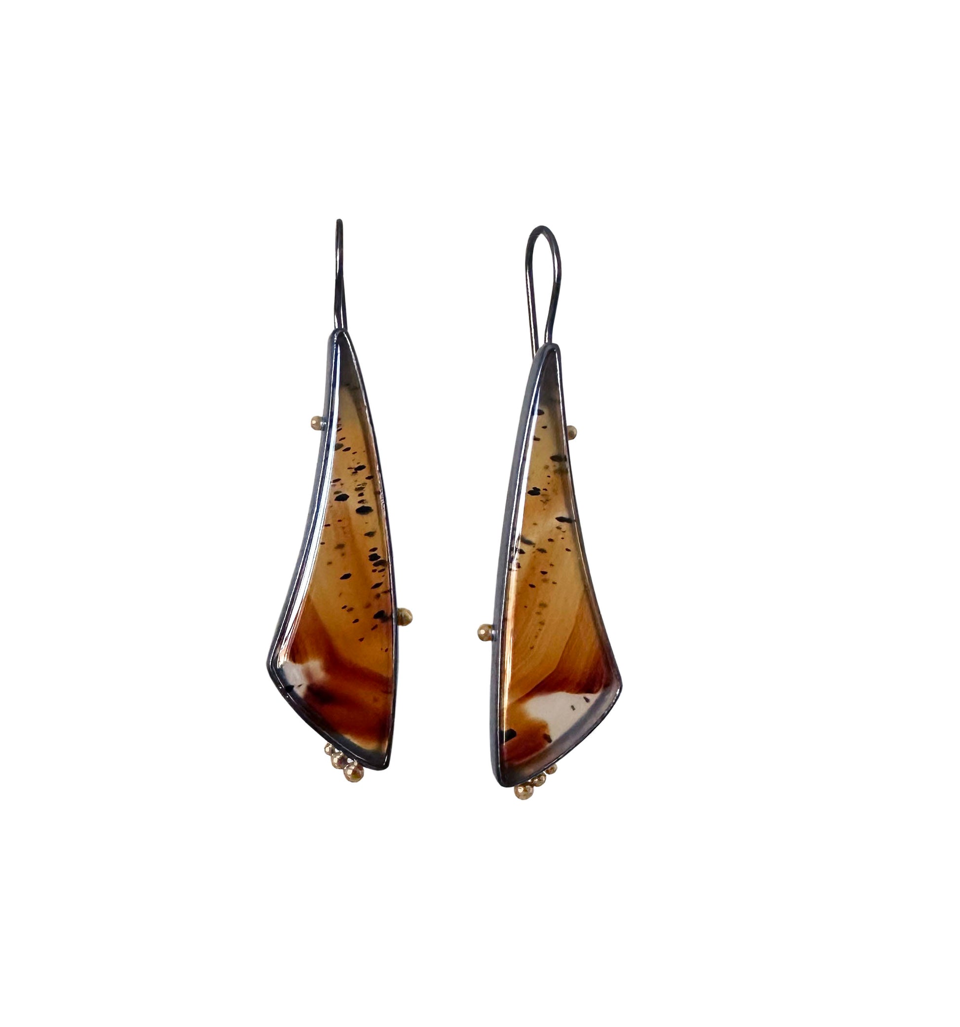The focus of these earrings are two designer cut Montana agates with a beautiful translucency and pattern. They are each complimented with five solid 18k yellow gold ball details. The remainder earrings are handmade out of sterling silver, which has been given a brushed, oxidized patina.