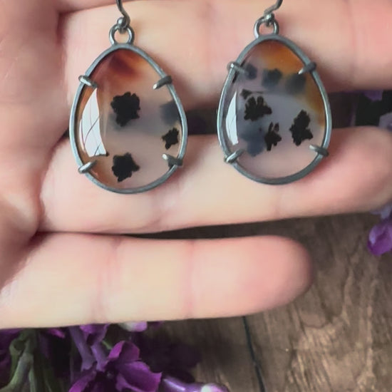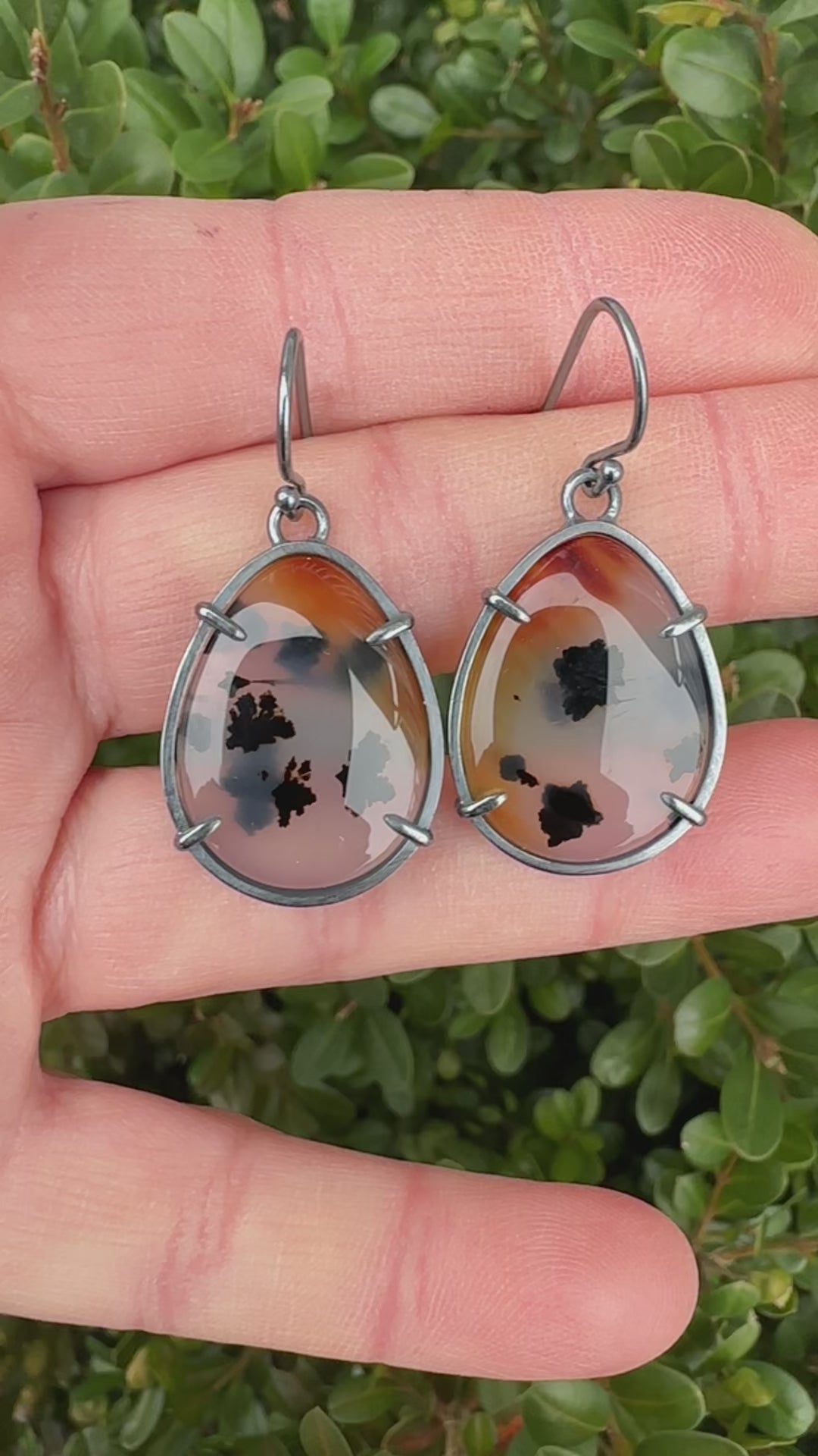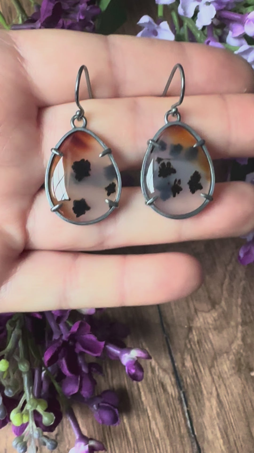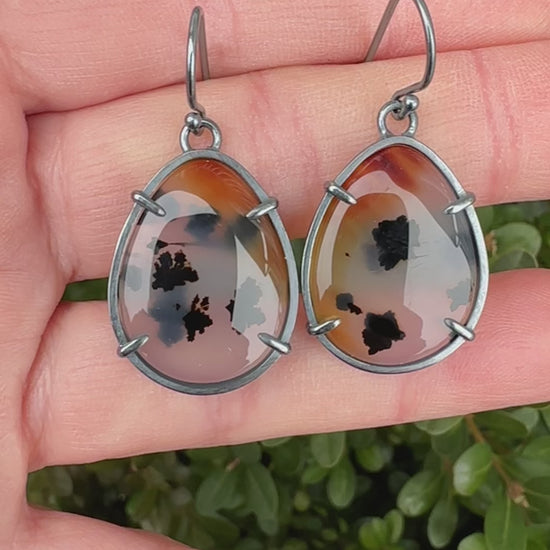 The focus of these earrings are Montana agates with a beautiful color and pattern. The earrings are handmade out of Sterling silver, which has been given a brushed, oxidized patina.
