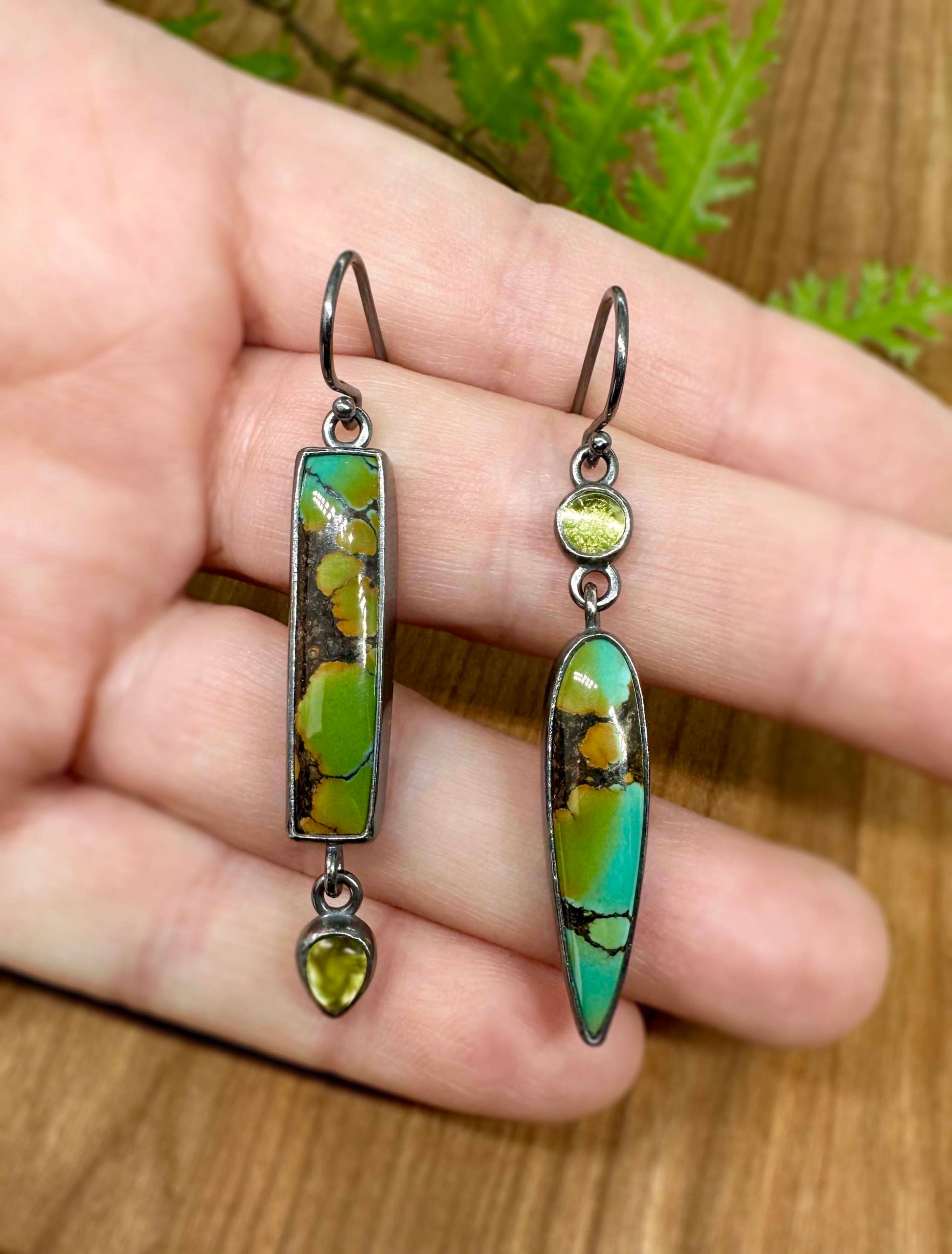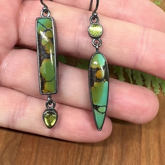 Polychrome Turquoise, Peridot and Sterling Silver Handmade Mix-matched Dangle Earrings