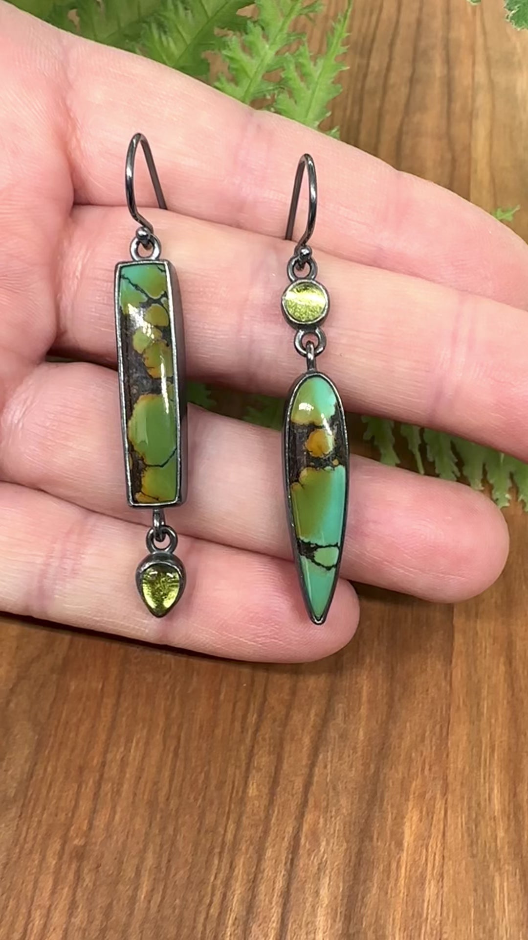 Gorgeous colored poly-chrome Hubei turquoise (stabilized) are paired with high grade peridot in these 'mix-matched dangle earrings. The earrings are handmade out of sterling silver which has been given a bushed, oxidized finish.