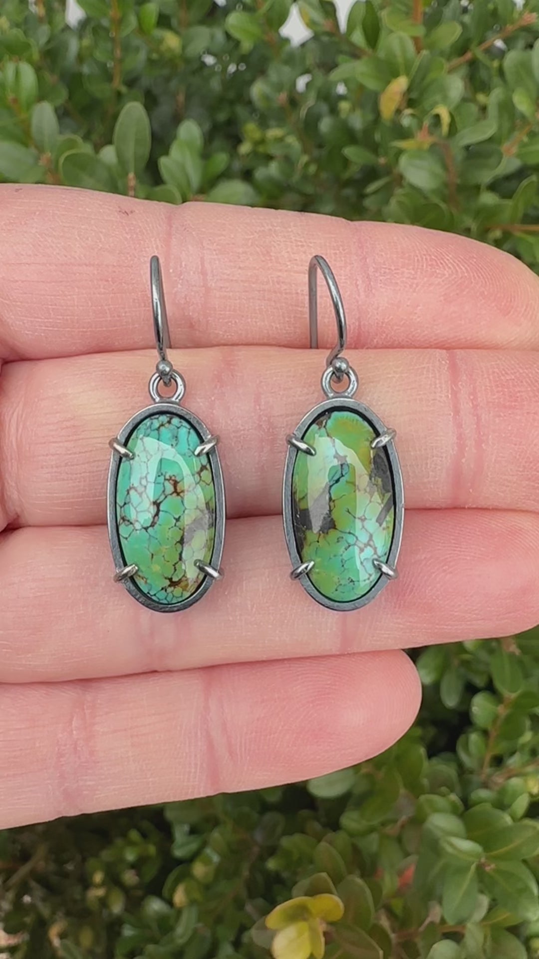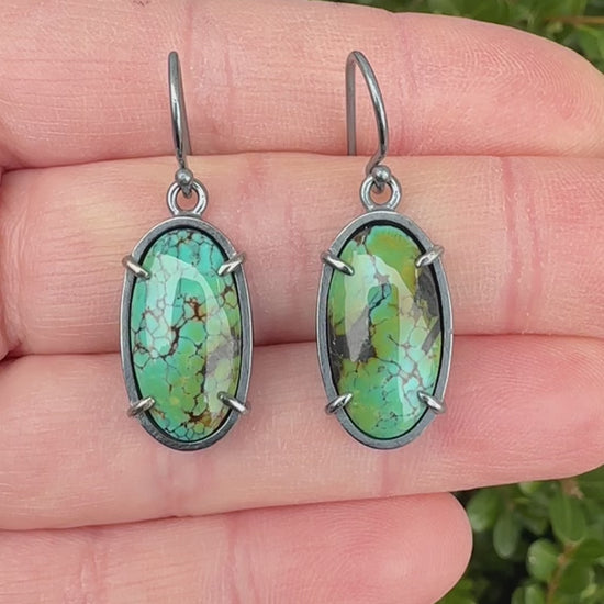 Gorgeous colored poly-chrome Hubei turquoise (stabilized) are the focus of these dangle earrings earrings. The earrings are handmade out of sterling silver which has been given a bushed, oxidized finish.
