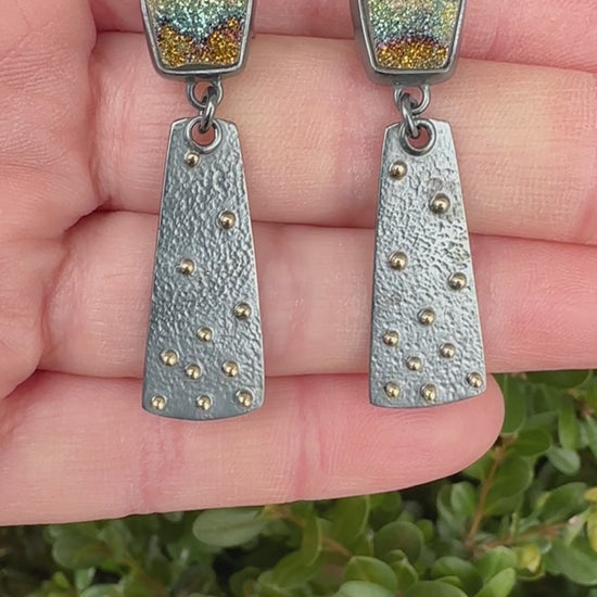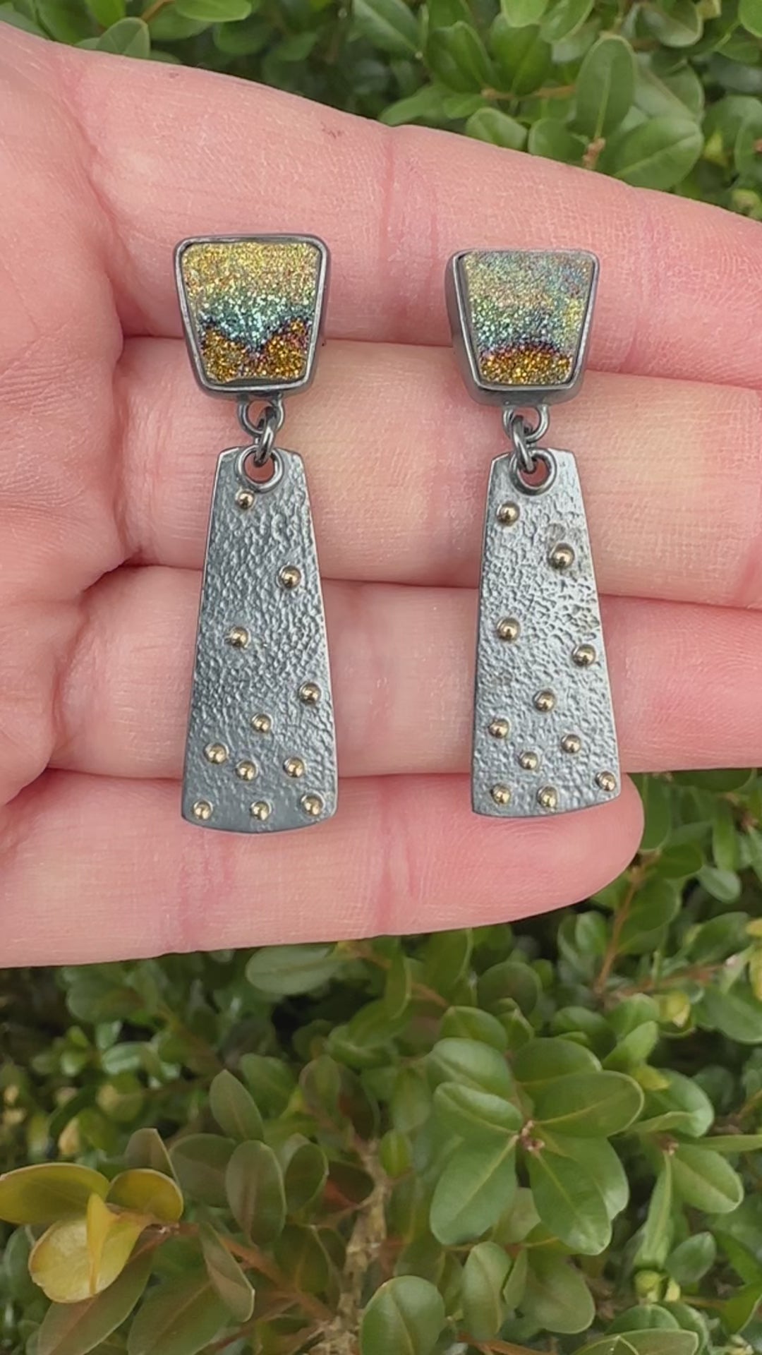 The focus of these earrings are two rainbow pyrite drusy cabochons. The Earrings are handmade out of Sterling silver, which has been given a brushed, oxidized patina and 18k gold. These earring are stud style with posts in the back of the pyrite.