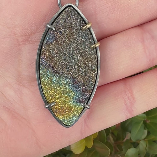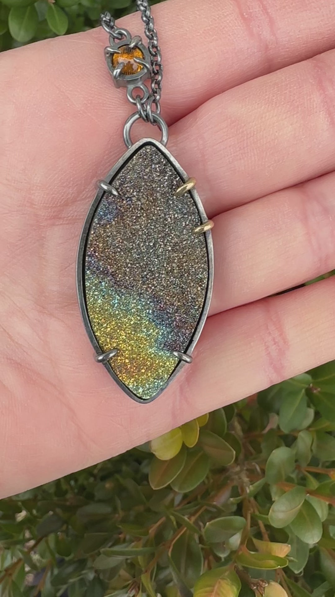 A colorful, sparkling rainbow pyrite drusy is the focus of this pendant necklace. The gold tones in the stone are paired with a high grade citrine cabochon which dangles beside it.