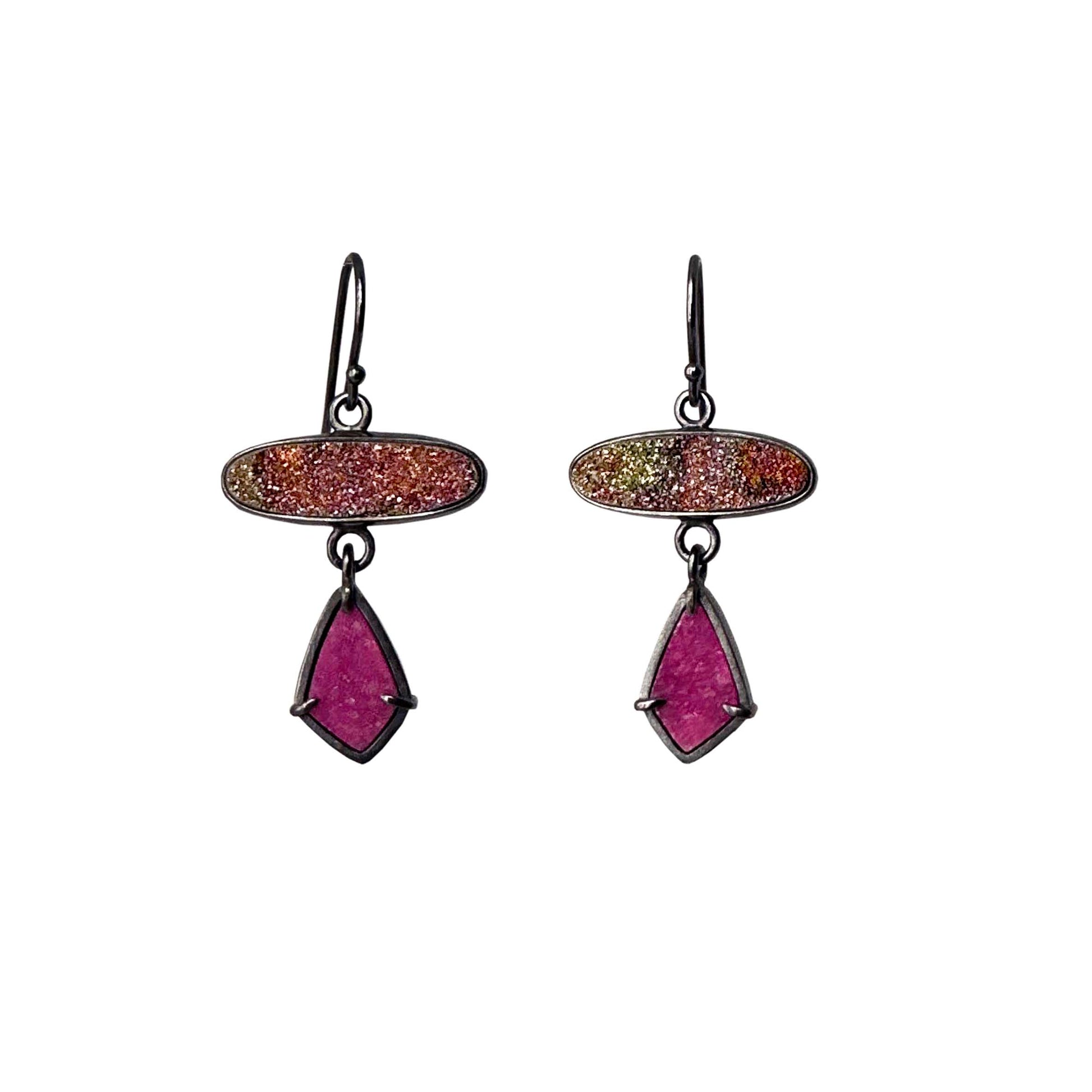 The focus of these earrings are two sparkly rainbow pyrite drusy cabochons that have been paired with natural color pink cobaltocalcite drusys. The Earrings are handmade out of fine and sterling silver, which has been given a brushed, oxidized patina.