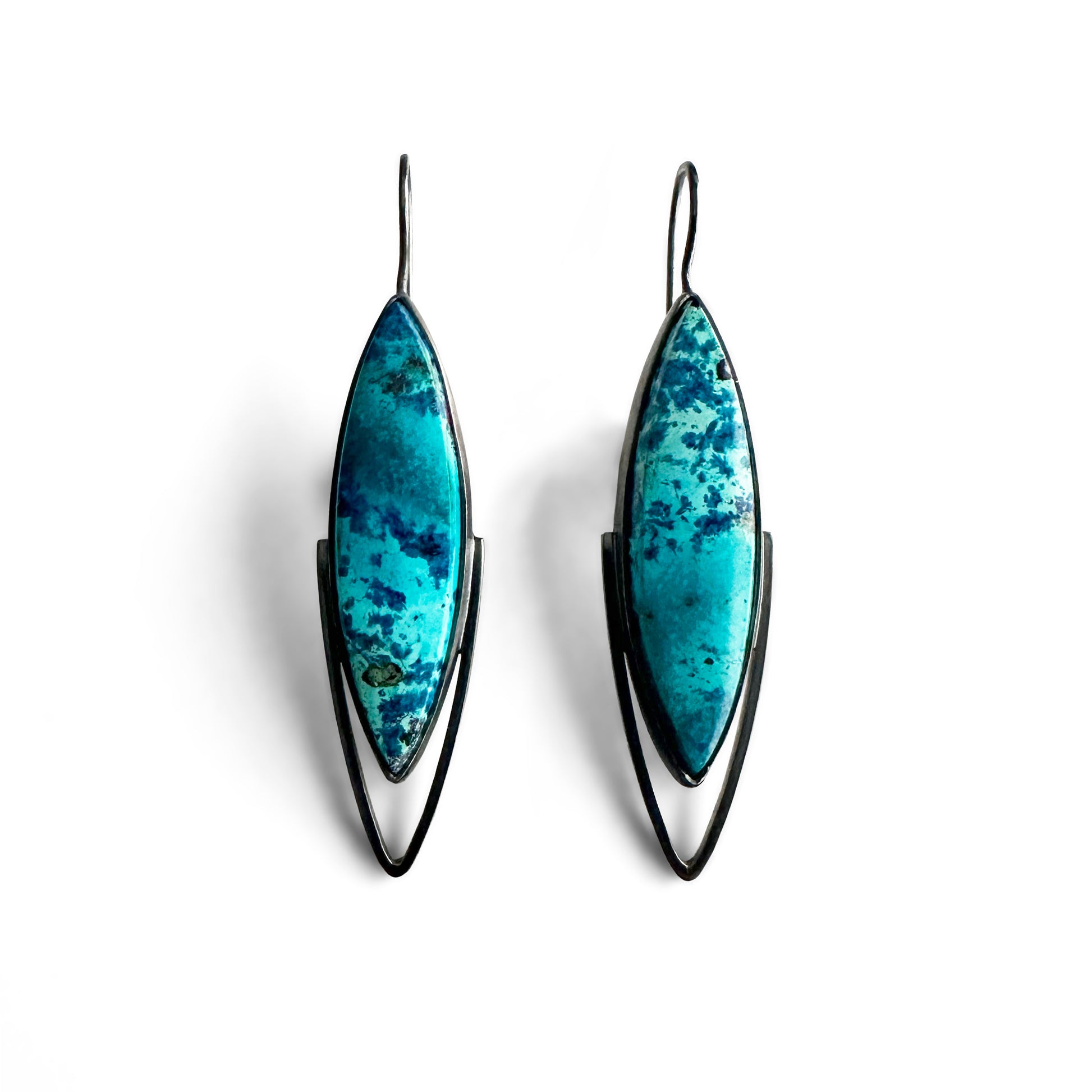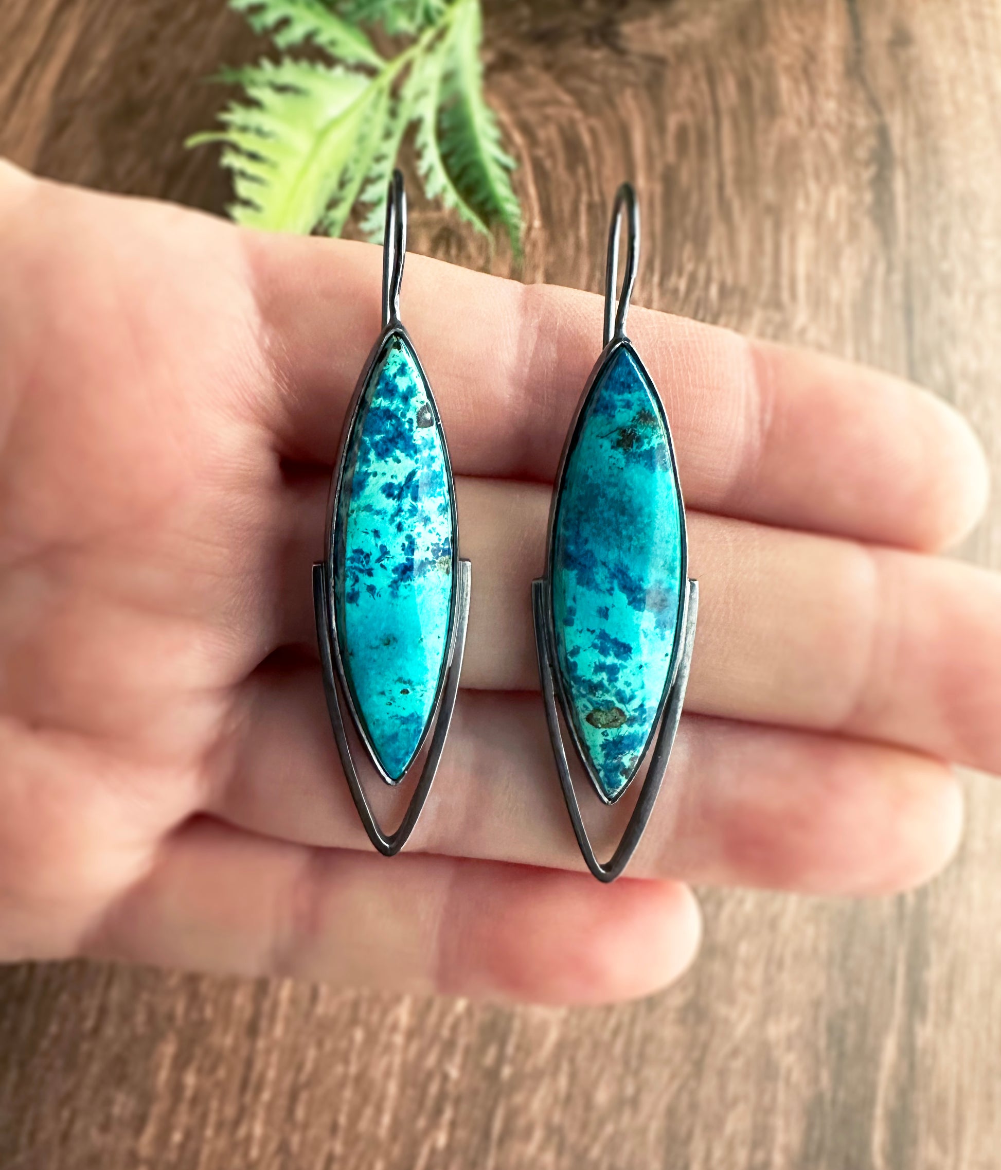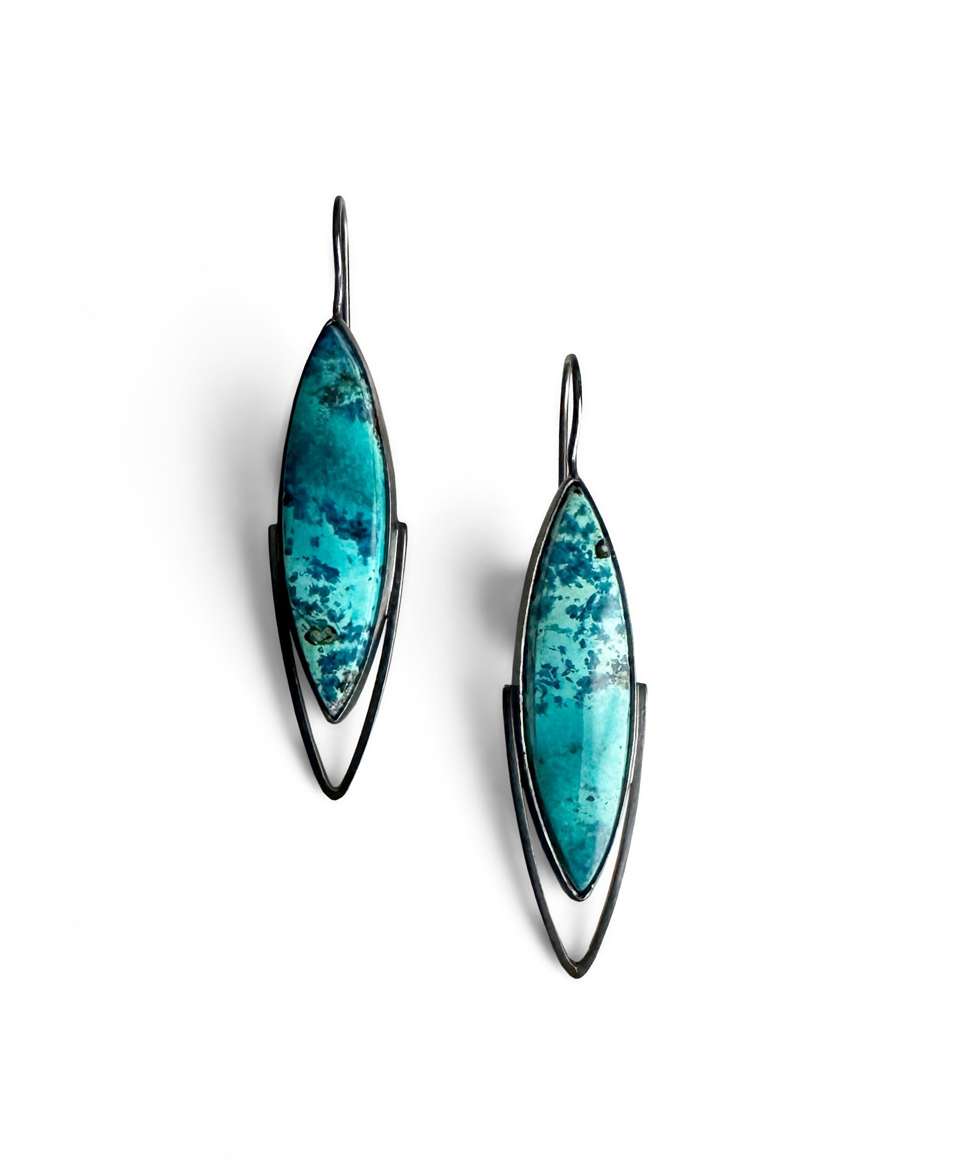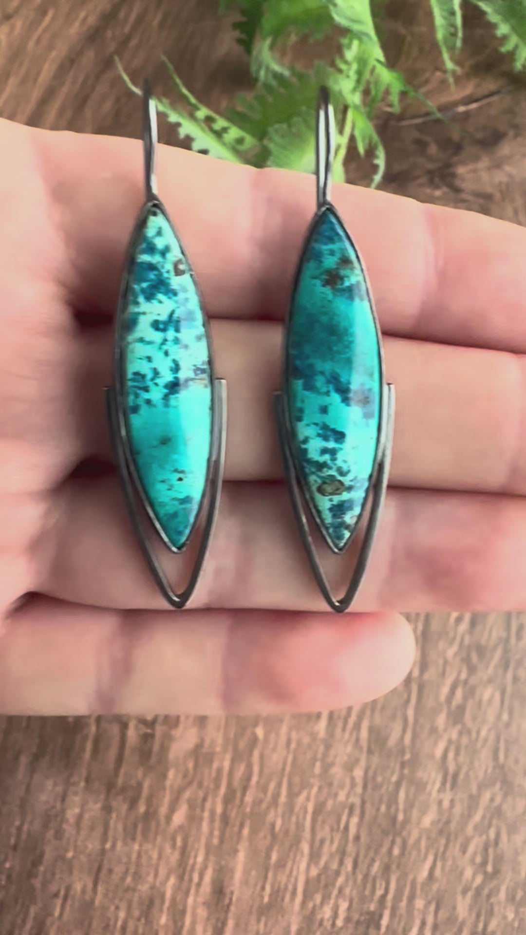 These dangle earrings include two high grade, marquise shaped shattuckite chrysocolla cabochons. The earrings are handmade out of fine silver and sterling silver which has been given a brushed, oxidized finish.