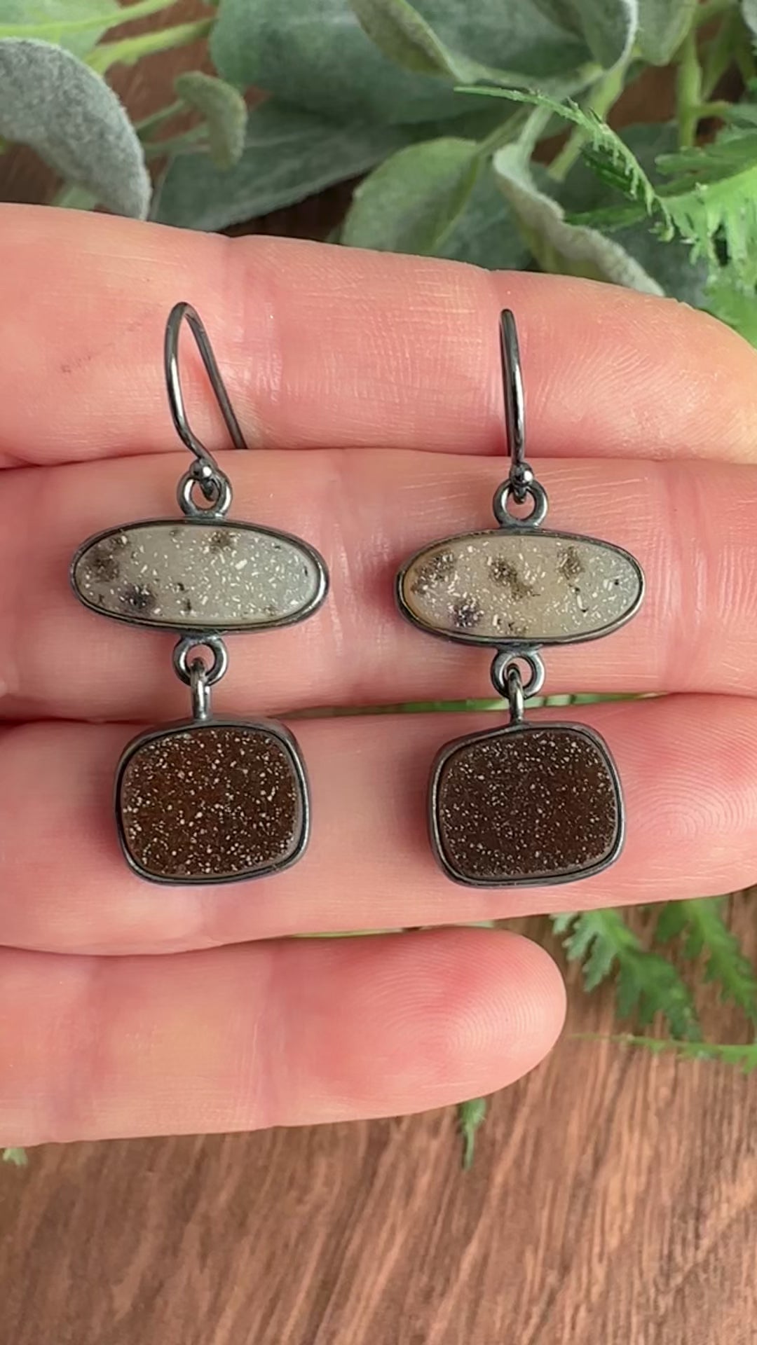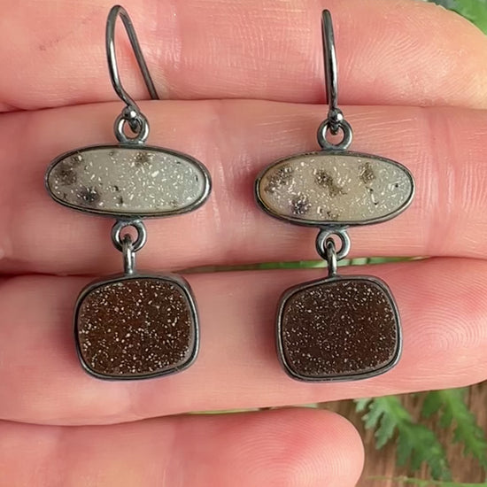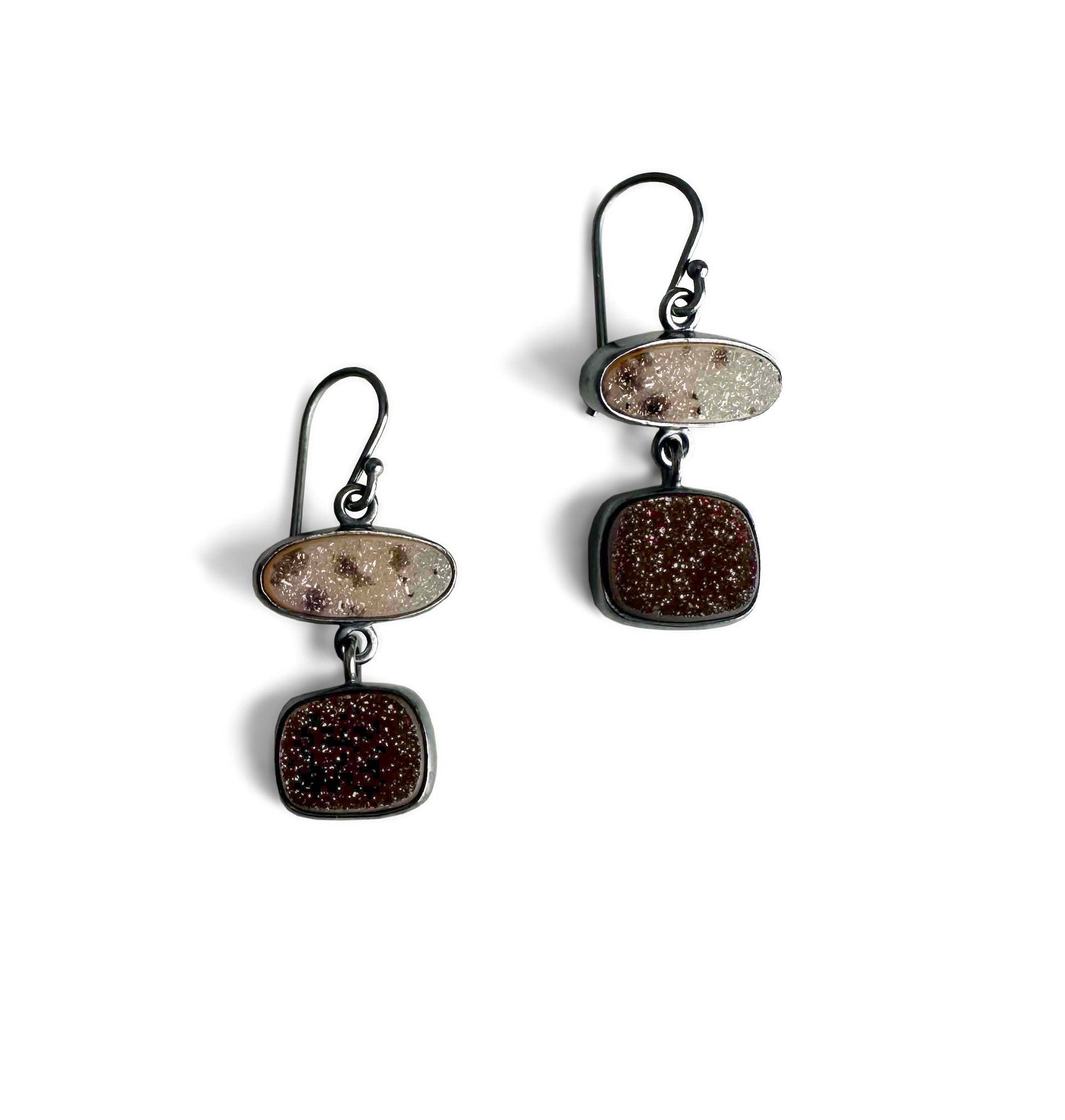 Two beautiful, natural color sparkling drusys from Brazil are paired in these smaller size dangle earrings. On the top are small elongated, spotted ovals and the drusys below are a dark chocolate brown. The earrings are handmade out of fine and sterling silver which has been given a brushed, oxidized patina.